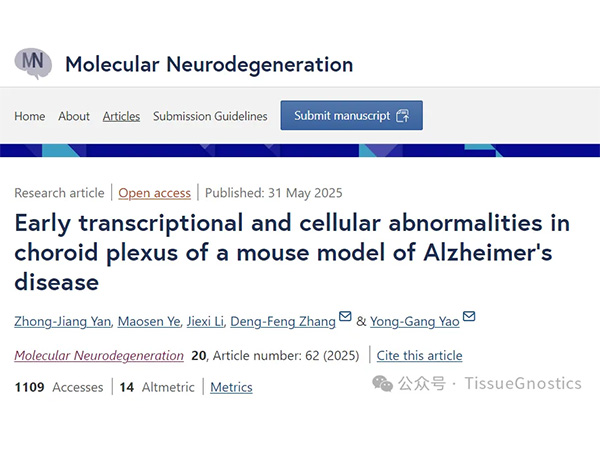 阿爾茨海默?。ˋD)是一種進行性神經(jīng)退行性疾病,其特征為 β 淀粉樣蛋白(Aβ)斑塊沉積、 tau 蛋白過度磷酸化以及神經(jīng)炎癥。脈絡(luò)叢(ChP)作為血 - 腦脊液屏障,在應(yīng)激免疫反應(yīng)和腦內(nèi)穩(wěn)態(tài)維持中發(fā)揮關(guān)鍵作用。然而,脈絡(luò)叢在 AD 進展中的細胞與分子機制仍未被充分闡明。2025 年 5 月 31